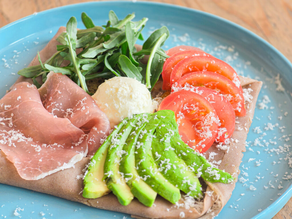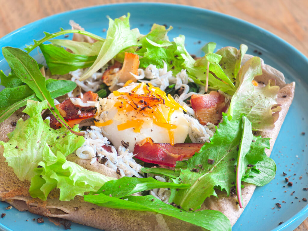 そば粉のガレットにしらすのやさしい塩味とベーコンのコクを足し、